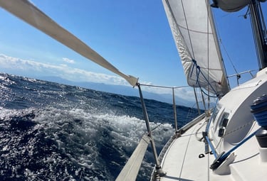 Stage de voile en immersion et croisière. Privatisation obligatoire du bateau pour une expérience complète et personnalisée. La destination est décidée en fonction de la météo pour garantir la meilleure navigation possible.